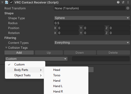 When working with Contact Senders and Receivers, the VRChat SDK offers a number of built-in contact tags that you can use. Using these tags is optional, and you can type in whatever text you'd like for your tags instead if you'd prefer, but using the built-in tags makes it easier to create contacts that are compatible with avatars and worlds that you didn't make yourself. For example, you might have a receiver in a world that responds to an avatar's hand, or a receiver on an avatar that reacts to touching a hot or cold surface.